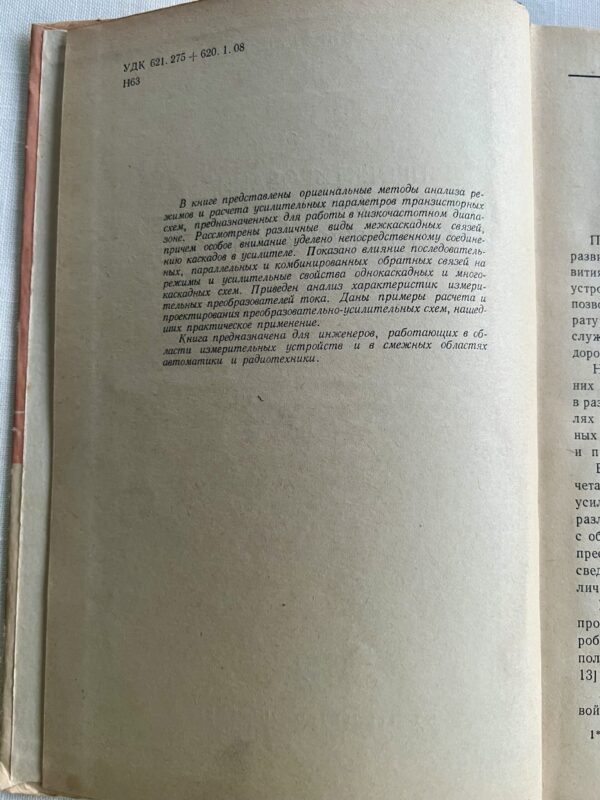 Просим обратить внимание, что вы покупаете букинистическую книгу в магазине “Книгоед”. Мы прилагаем максимальные усилия, чтобы предоставить актуальное состояние каждой книги на фотографиях. Таким образом, вы получите именно тот экземпляр, который видите на фото. Описание книги: В книге представлены оригинальные методы анализа режимов и расчета усилительных параметров транзисторных схем, предназначенных для работы в низкочастотном диапазоне. Рассмотрены различные виды межкаскадных связей, причем особое внимание уделено непосредственному соединению каскадов в усилителе. Показано влияние последовательных, параллельных и комбинированных обратных связей на режимы и усилительные свойства однокаскадных и многокаскадных схем. Приведен анализ характеристик измерительных преобразователей тока. Даны примеры расчета и проектирования преобразовательно-усилительных схем, нашедших практическое применение. Книга предназначена для инженеров, работающих в области измерительных устройств и в смежных областях автоматики и радиотехники.